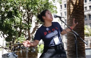 High school senior Vanessa Tahay recites a poem of hers during a public recital at Pershing Square in Los Angeles on May 23, 2017. Gina Ferazzi/Los Angeles Times/TNS